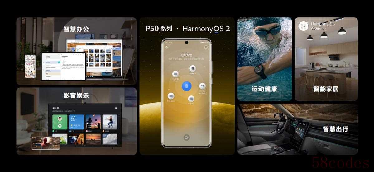 在HUAWEI P50系列控制中心的超级终端界面,手机图标位于中心位置,其它设备悬浮围绕在四周,只需按住设备图标向手机图标轻轻一拉,即可连接成功。例如办公环境下,将平板图标拉至手机,手机便与平板完成了协同。同时,手机通过无线方式作为PC的盘符,满足与PC的跨端访问。用手机播放视频时,将智慧屏图标拉至手机,视频便会投屏到智慧屏上播放。点击手表上的赛事提醒能直接在配对的手机上播放。轻轻一碰快速完成智能家居配网,让智能设备更聪明、更好用。