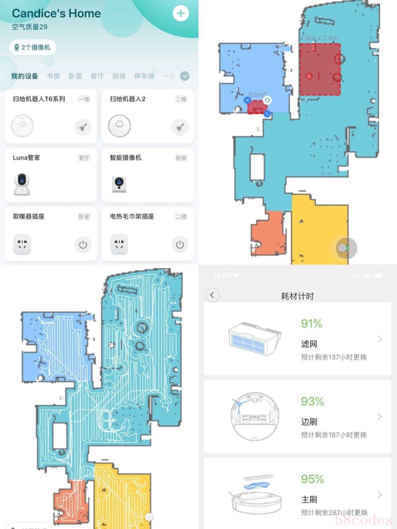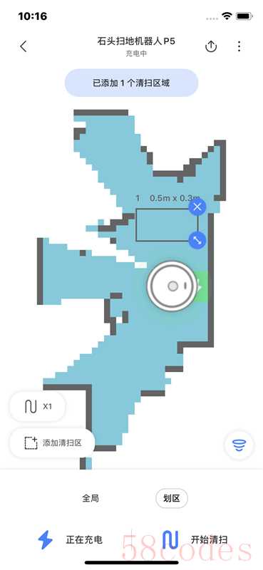 其中,不同颜色的区域代表不同房间,点击可选择专注清扫某一房间。 点击“划区清扫”可以拖动缩放选框,选择某一清扫区域。就像人一样,可以按房间清扫,想扫厨房扫厨房,想扫卧室扫卧室。