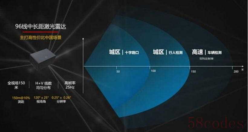 不过线程数增加同时意味着发射源和接收器数量的增加,这成本肯定是水涨船高的。所以厂商也要根据自家产品激光雷达的使用场景合理规划线程数量,以华为的中长距激光雷达为例,96线程,10%反射率下能达到150米的探测距离,同时拥有120°的水平视角和25°垂直视角,非常适合城区场景。再远,探测效果就下降得厉害了。