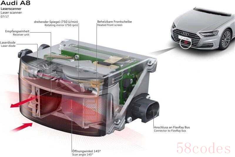 不难看出,混合式激光雷达避免了大规模的机械旋转,体积可以做得更小,也在一定程度上提高了可靠性。我们来看一款成品,2017年奥迪推出新一代A8,这也是混合式激光雷达首次搭载到量产车上面,布置于牌照区下方。从外面我们看不到激光雷达的旋转动作,但它可以提供145°的水平视角,80米的有效探测距离。混合式激光雷达,里面还是有个伺服电机,能否进一步减少机械运动呢?可以!全固态激光雷达,其中“固态”指的就是内部结构全部固定,彻底不存在机械运动。目前,实现全固态有两种途径,一种是光学相控阵(OPA),一种是闪光(Flash)。