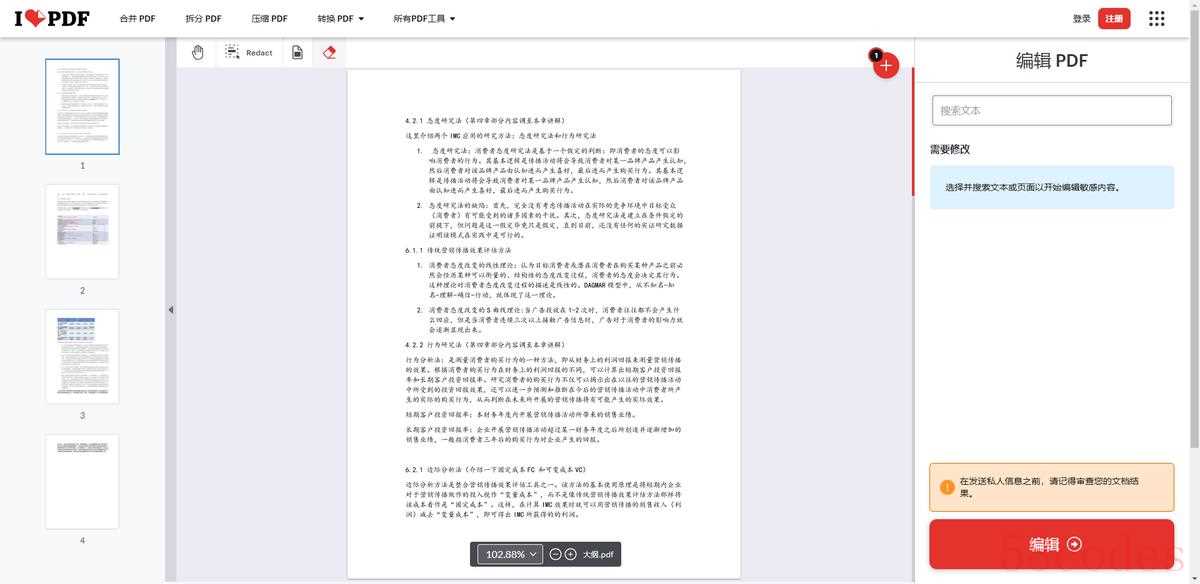 一个常见的PDF在线网站,可以用来编辑、转换、压缩PDF文档,网站可以在线对PDF中的文本进行编辑的编辑,还能插入图片和形状等操作,适合临时在需要修改PDF的场景下使用。
