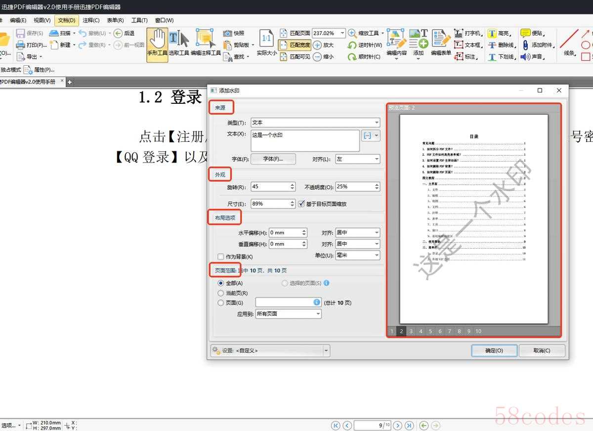 还可以为PDF文档添加水印,只需要打开【文档】中的【水印】功能,在添加水印界面设置合适的水印内容、透明度、位置等参数,就能快速为PDF文档设置水印。