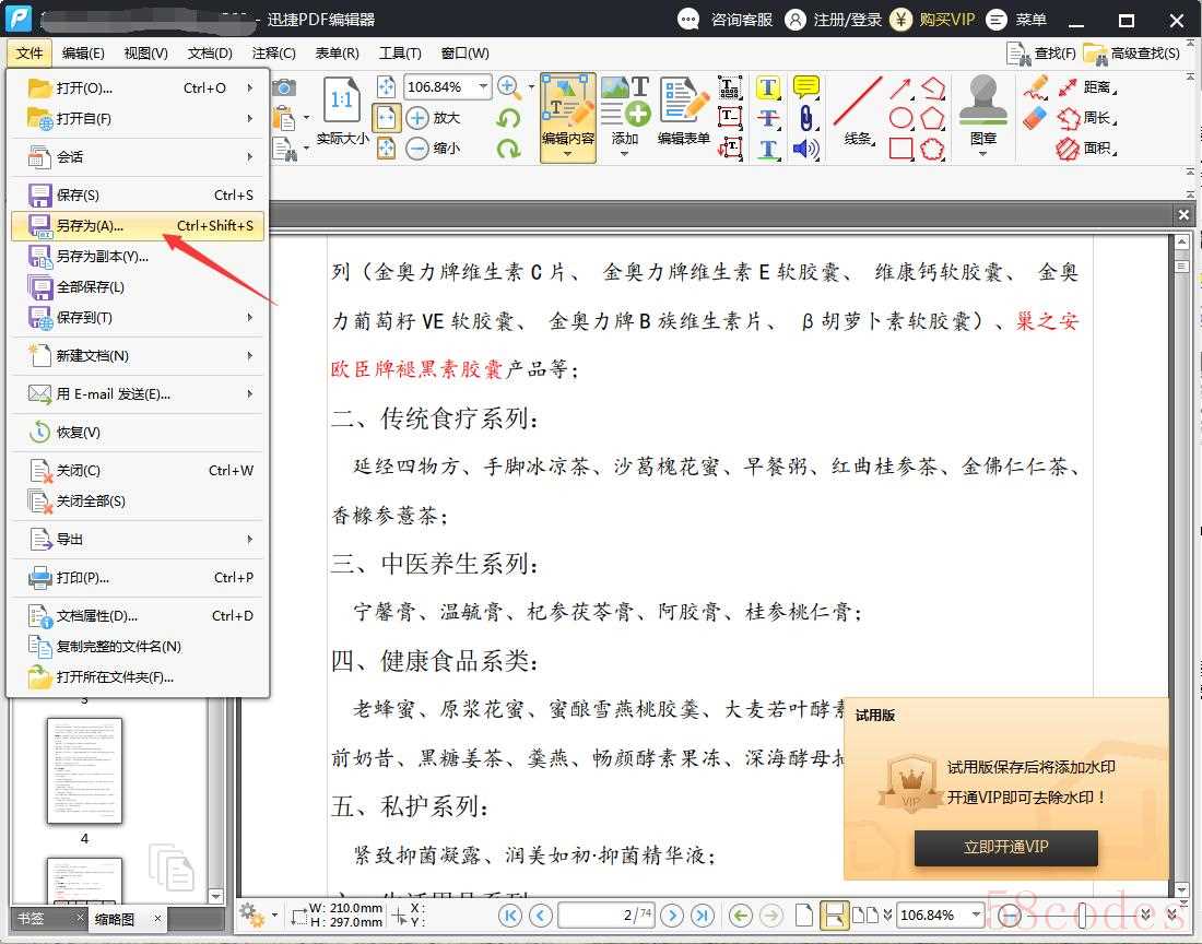 最后,我们编辑完文档后,点击左上角的“文件”选项,找到“另存为”选项,把编辑好的文件另存到便于找到的位置即可。