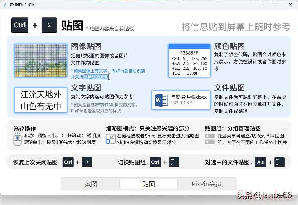 四、使用教程PixPin 拥有强大的截图功能,但不只是一款截图工具PixPin目前支持Windows系统和MacOS系统PixPin的基本使用只需要记住两个热键,截图:Ctrl + 1 贴图:Ctrl + 2当你想记录当前屏幕的部分内容,可以按下截图Ctrl + 1键,选择你想记录的区域,然后按下贴图:Ctrl + 2键,你所选择的区域就可以贴在屏幕上,供你参考查阅;你也可以在选择好记录的区域后,双击把屏幕区域的图像记录到剪贴板内,然后在微信,Word等其他软件的输入框中按下粘贴键来粘贴。1、PixPin是什么https://pixpin.cn/docs/start/what-is-pixpin.html
