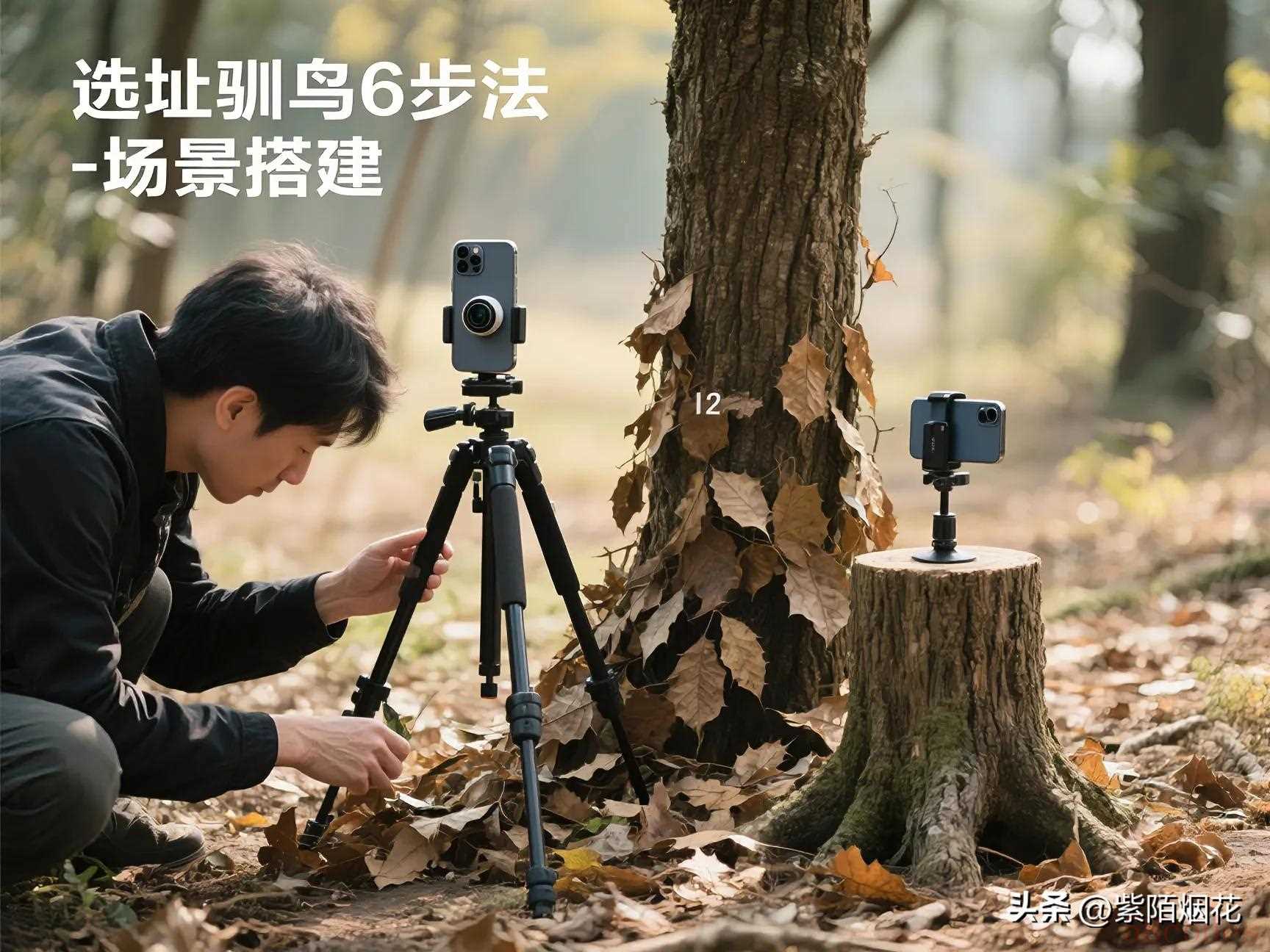 在距树干1.2米处架设三脚架(安全进食距离),用枯叶伪装设备