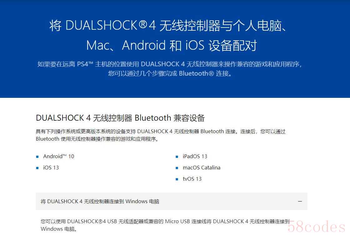 目前的PS4手柄可以完美的兼容Win10系统以及其他诸多移动或电脑系统,譬如IOS,安卓,IPadOS,Mac OS等等,关于这方面的消息我们其实可以在索尼的官方网站上就得到较为详细的介绍,如下图所示:
