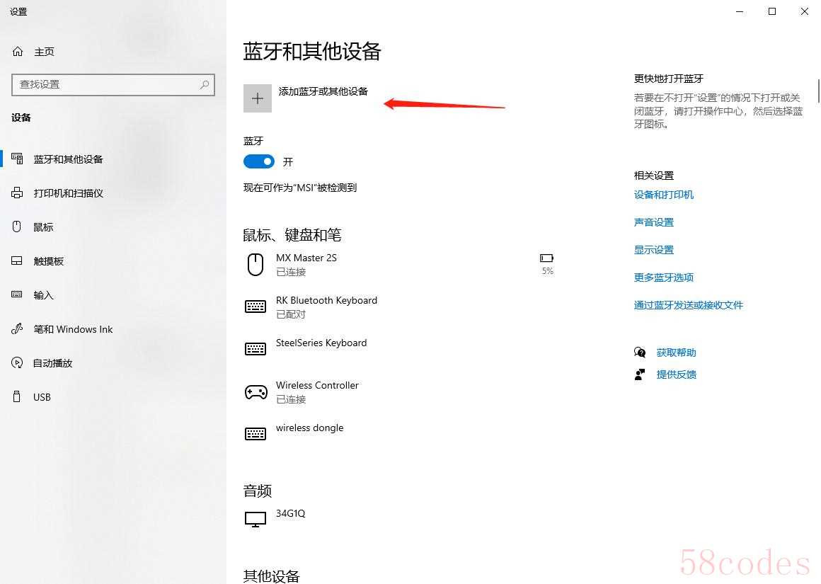 如果你的电脑本身支持蓝牙或者购买了蓝牙接收器,那么在系统的右下角就会有一个蓝牙标志,双击这个按钮打开蓝牙设置窗口,然后点击“添加蓝牙或其他设备”这个按钮即可。