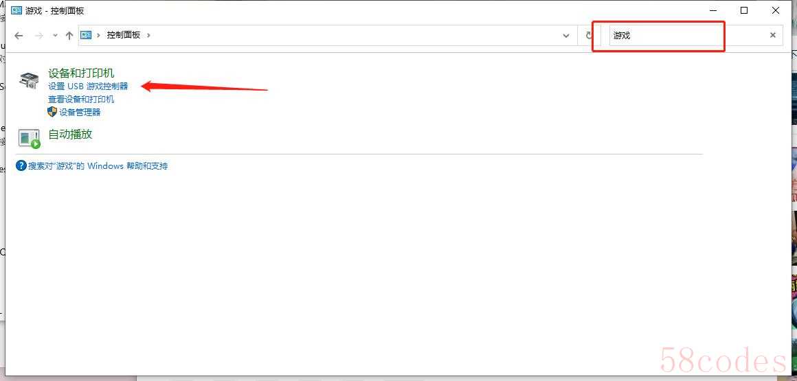我们打开控制面板,然后在右上角的搜索框中输入游戏,即可看到在窗口左侧出现了“设置USB游戏控制器”这个选项,然后我们单机这个设置项,