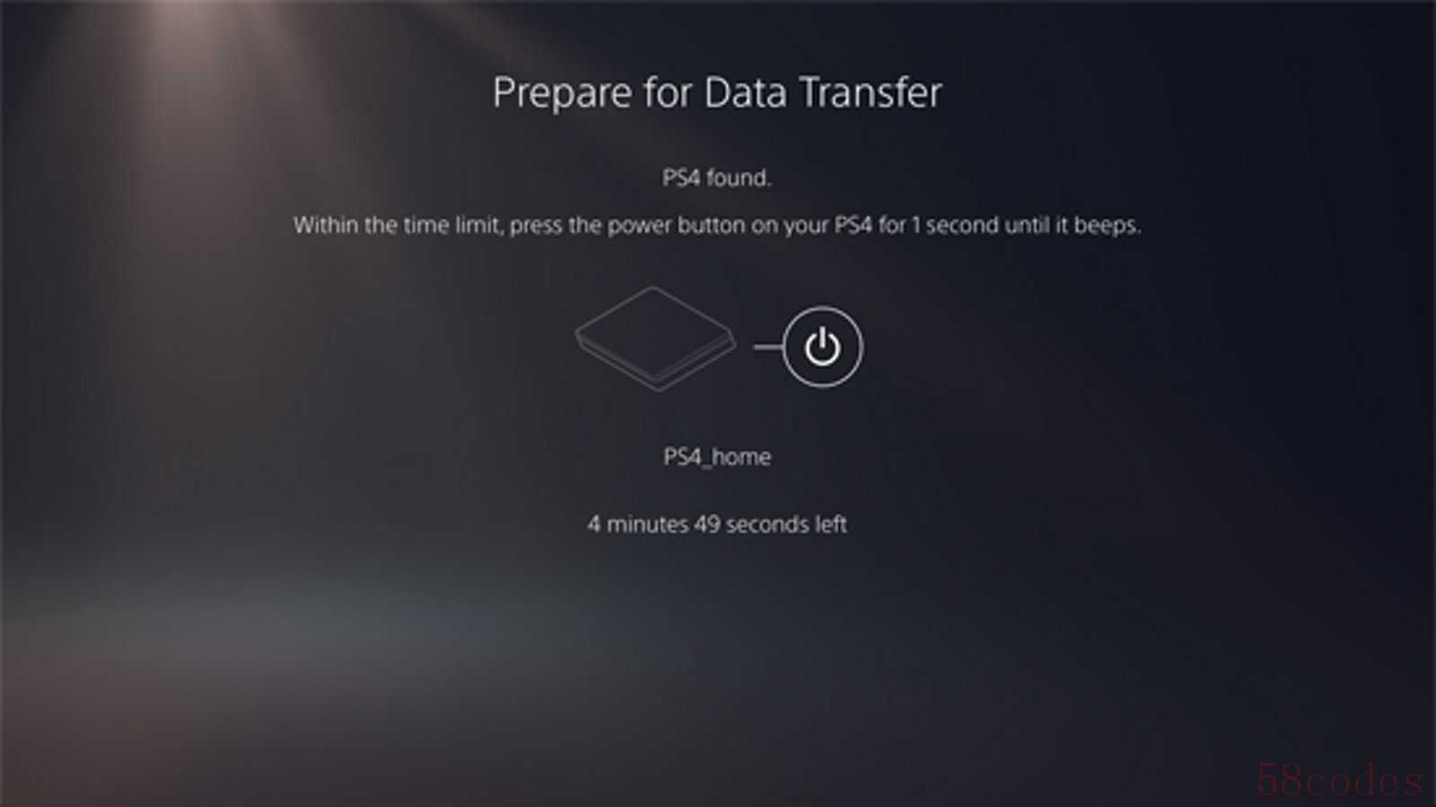 当 PS5 主机显示消息「准备进行数据传输」时,按住 PS4 主机上的电源键至少一秒钟(直到听到蜂鸣声为止)。