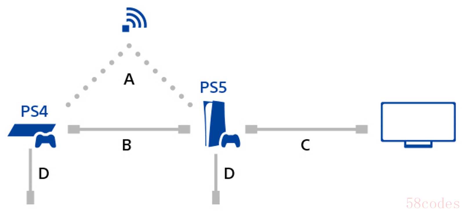 将 PS5 和 PS4 主机连接到同一网络。可以使用网线或 WiFi 连接。下图是 PS5 和 PS4 主机无线连接的示例。