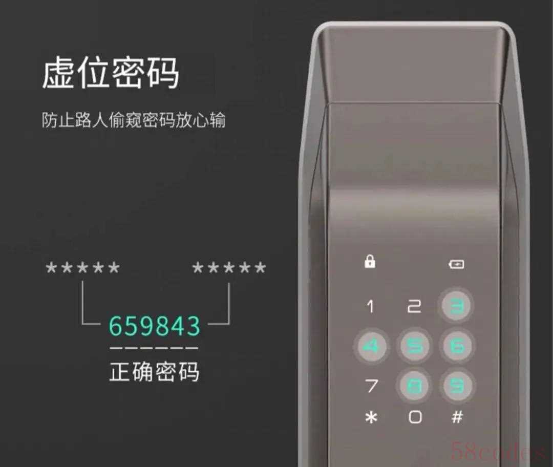 △锂电池,没电需要充电不管选择什么样的电池形式,建议选择有低电量提醒功能的门锁,快没电的时候可以提前充电或更换电池,不然真遇到没电的情况进不了门也是怪恼火的~~~6、其他安防功能① 防尾随密码锁也就是虚位密码,输密码的时候随便输,只要其中包含正确密码就能开锁。这种功能可以让偷窥狂无从下手,也不会在密码按键上留下明显痕迹导致密码泄漏。