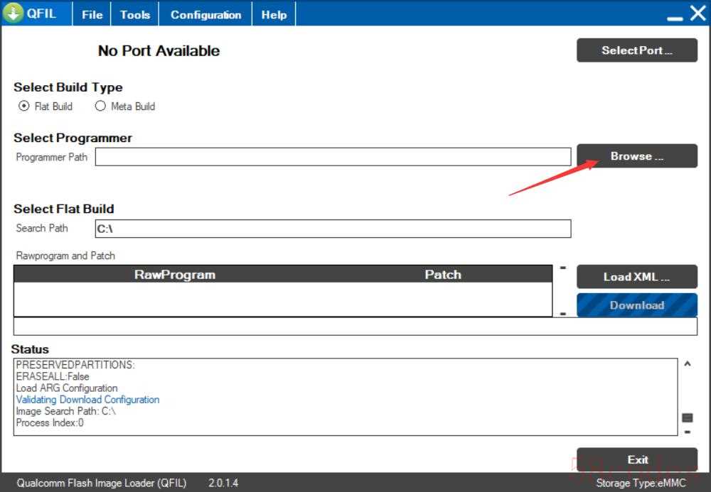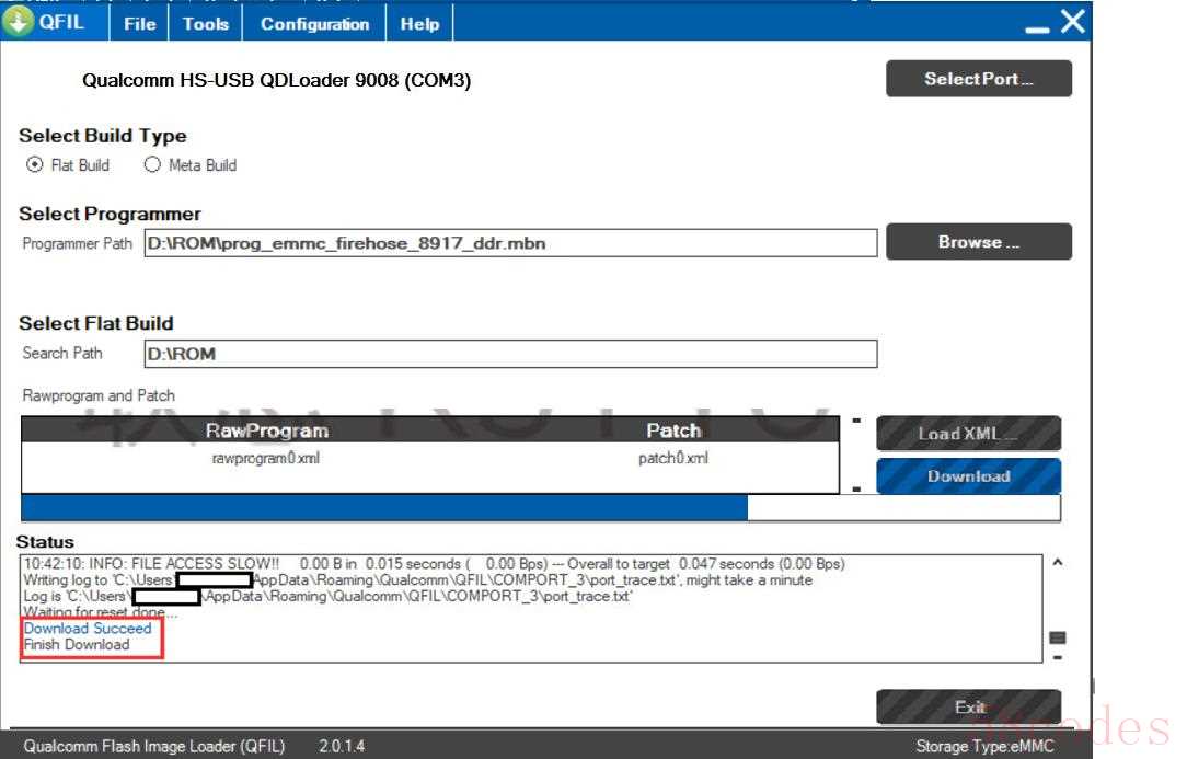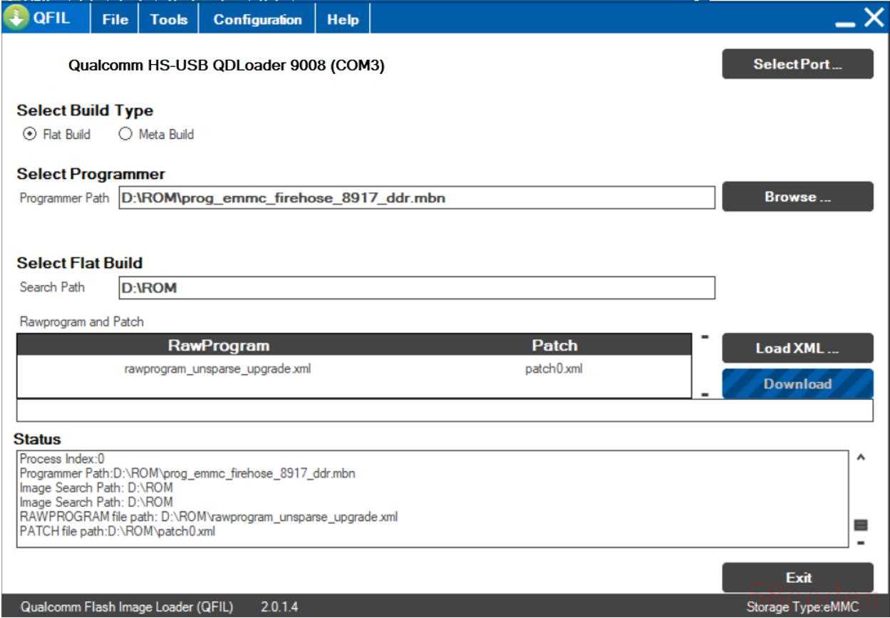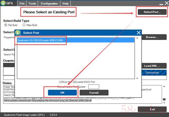 (注意:如果QFIL工具提示 please select an existing port,请点击右上角select a port,勾选9008点击OK)