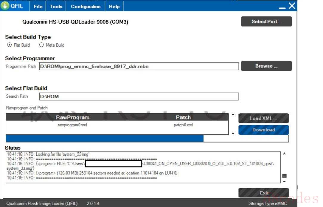 7、手机关机,同时按住音量上和下键,USB数据线插入手机,然后手机振动一下闪现充电标志,然后放开音量键,大概等待3-5s左右,QFIL软件自动识别到9008端口,这个时候才可以点击“Download“, 开始刷写固件,然后蓝色进度条开始走动。 (请注意操作方式,如果没有进入9008端口,就刷不了机)