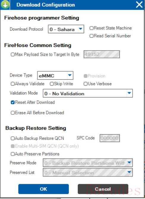 2、点击“QFIL”打开升级工具(路径:开始菜单- 所有程序-QPST-QFIL);打开QFIL进入“QFIL”的“Configuratiion”标签页的 “FireHoseConfiguration”,按如下红框部分进行配置,点击OK确认保存。