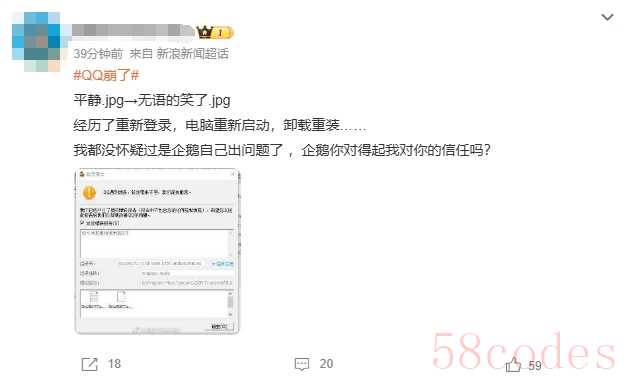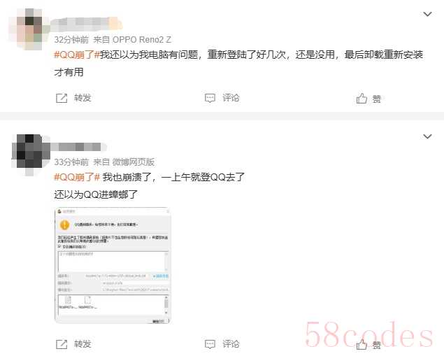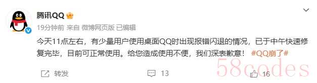 @腾讯QQ 发布微博致歉:今天11点左右,有少量用户使用桌面QQ时出现报错闪退的情况,已于中午快速修复完毕,目前可正常使用。给您造成使用不便,我们深表歉意!