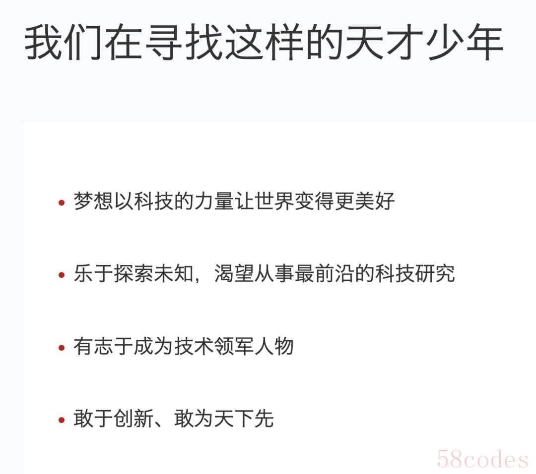 虽招聘公告上本身没什么硬性要求,也没有限制学历和学校,但“天才少年”的考核流程相当严苛,包括3轮技术面试、专家面试、主管面试、技术副总面试、总裁面试,一共7轮,最终筛选出来的都是精英中的精英。