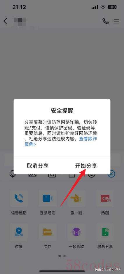 5. "开始共享:" 点击“开始共享”按钮,你的屏幕将被共享给对方。对方将看到一个视频流,显示你的屏幕内容。