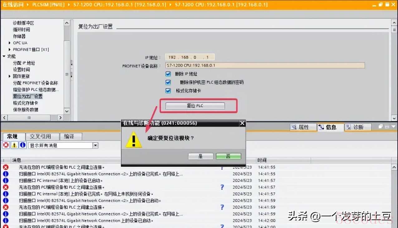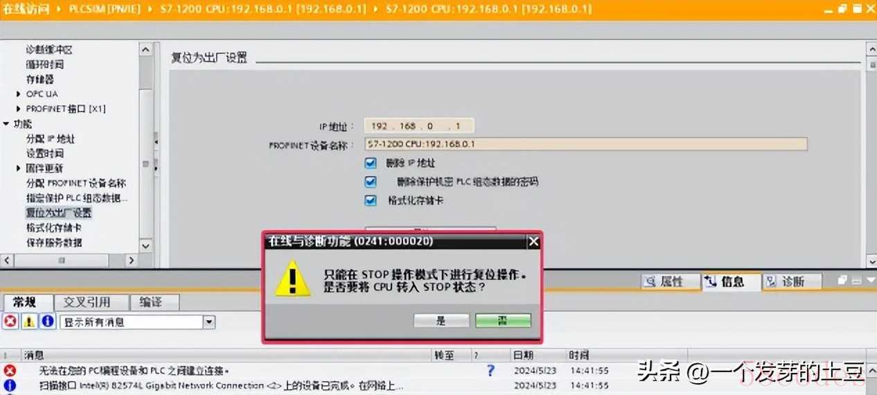 4、重置为出厂设置需要CPU在STOP操作模式下进行,在弹出的选择窗口中选择"是"