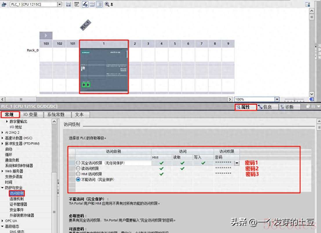 - “不能访问(完全保护)”:不允许任何访问,必须指定“完全访问权限(无任何保护)”的密码:“密码 1”。“读访问权限”的密码:“密码 2”和“HMI 访问权限”的密码:“密码 3”为可选设置。