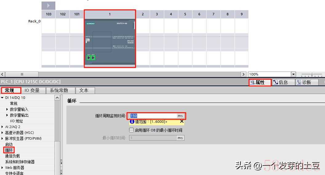 S7-1200 CPU的循环扫描时间(看门狗时间)默认为150ms,最大可修改为6000ms,如下图所示: