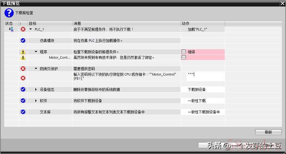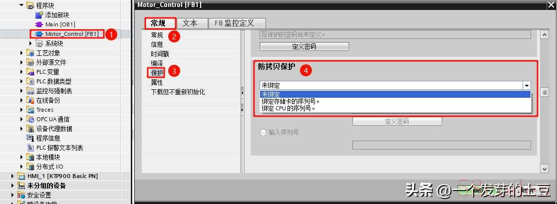 选择绑定存储卡的序列号或者绑定 CPU 的序列号,需要设置“防拷贝保护密码”,不定义密码则编译会报错;在下载程序时候必须输入下载块的密码。