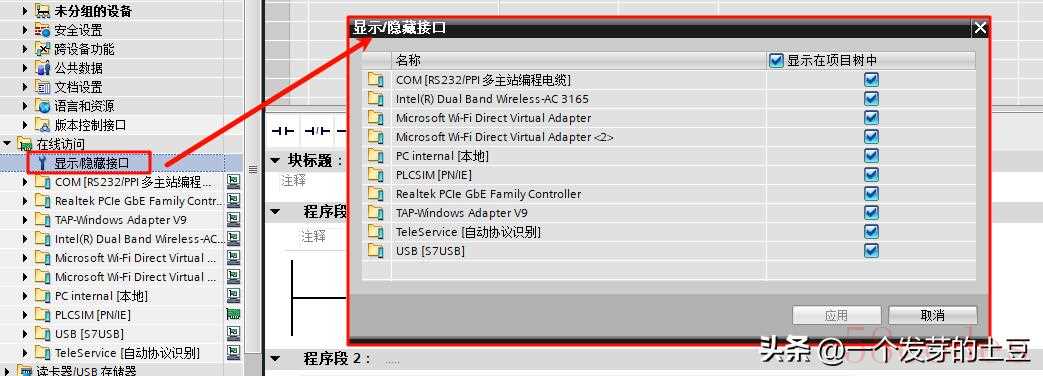 1、在TIA Portal软件中,点开"在线访问",找到PC机使用的网卡。如果没有出现该网卡的名称,双击"显示/隐藏接口",勾选网卡对应的复选框,点击"应用"即可;