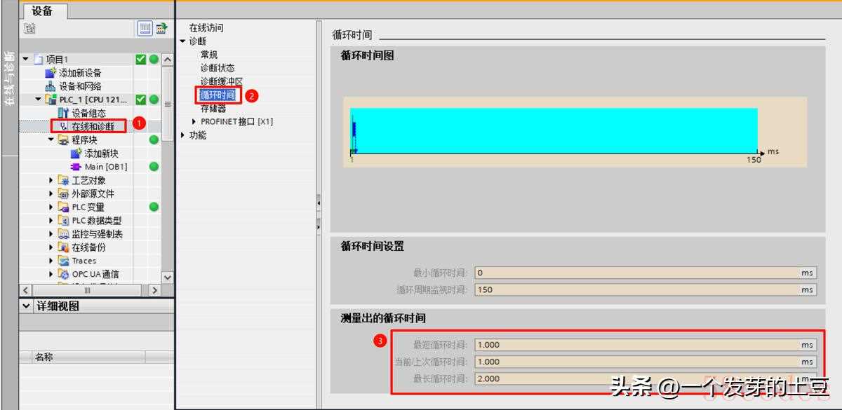 当编程结束后,需要了解程序的循环周期,将程序下载到PLC后,进行在线连接,通过“在线和诊断”--->“循环时间”