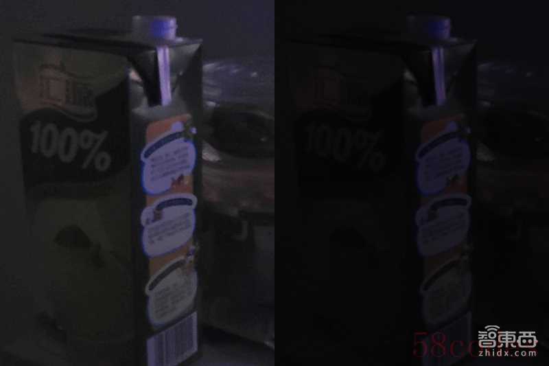 在半夜12点只留电脑屏幕最低亮度照明的情况下,人眼已经无法看到果汁包装上的任何细节了,但是S9+强行把ISO拉高后,看到了人眼也无能为力的细节——比如包装上橙子的轮廓。尽管在此条件下图像基本是被噪点填满,但手持拍摄下做到超越人眼,S9+可以说是真·夜视仪了。