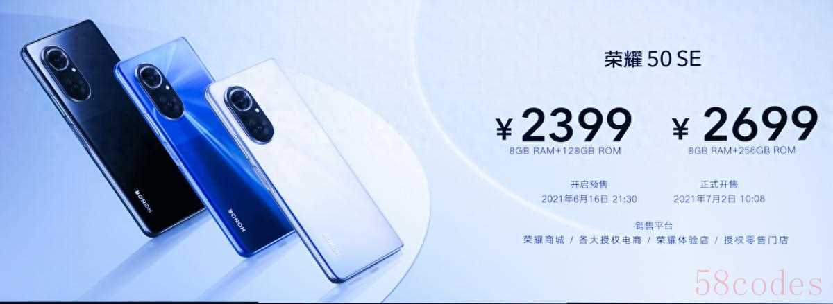 荣耀50 SE在发布后,众多媒体也在第一时间对这款手机进行了全方位的评测和体验,并且给出了诸多好评,凸显了荣耀50 SE强大的产品力。整体来说,荣耀50 SE用6.78英寸超窄全视屏,实现视觉触觉的双重体验提升,又有强大的影像能力和超级快充,是一款非常值得入手的潮流机型。荣耀50 SE正在火热预售中,拥有8GB+128GB,8GB+256GB两种版本,售价分别为2399元,2699元,将于7月2日正式开售。大家可以到荣耀商城、天猫、京东、苏宁易购等电商渠道参与预售,或者到荣耀线下门店亲身体验一下在做决定,荣耀50 SE一定会带给你惊喜的!