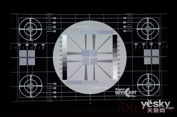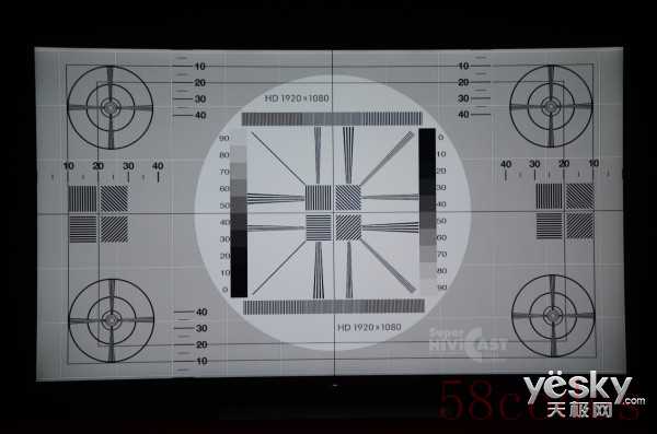 在黑白背景下的索尼X8500D动态清晰线测试(均为1080P模式),两幅画面中线条边缘显示清晰,四周圆线平滑无锯齿,内圆心无重影,斜线束线条清晰。