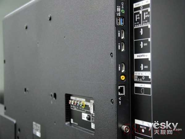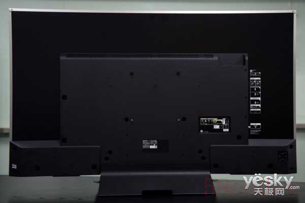 背部各种插孔和接口都位于电视的下半部分,这样上半部分能做得更薄,也更简洁。背部左侧下方靠近屏幕边缘位置保留了三颗传统按键,其中频道和音量键集成在一个上面,熟悉之后能轻松实现盲按。
