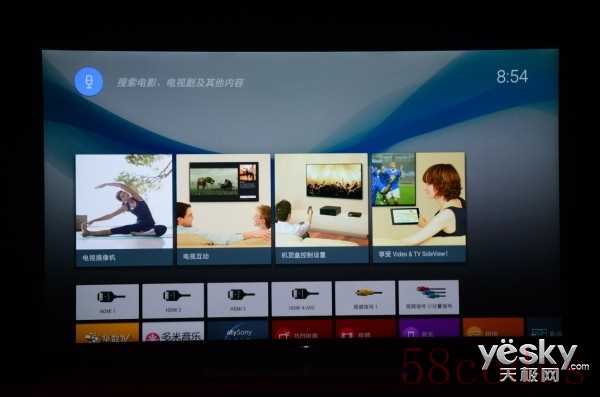 进入系统后是安卓电视系统常见的卡片式图标布局。同其他国产电视UI设计不同的是,索尼X8500D的界面非常简洁,所有功能都平铺在屏幕上,向下滚动也只有3屏内容。
