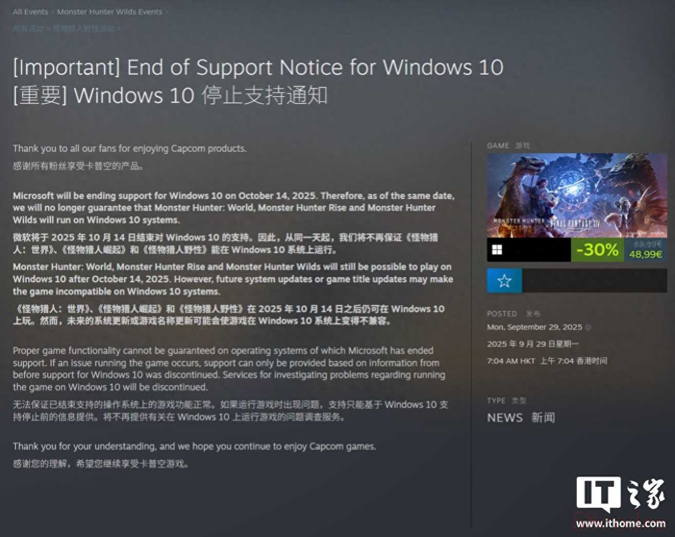 卡普空表示,微软将于 2025 年 10 月 14 日结束对 Windows 10 系统的支持,因此卡普空将在同日不再保证《怪物猎人:荒野》、《怪物猎人:崛起》和《怪物猎人:世界》游戏能持续在 Windows 10 系统正常运行。