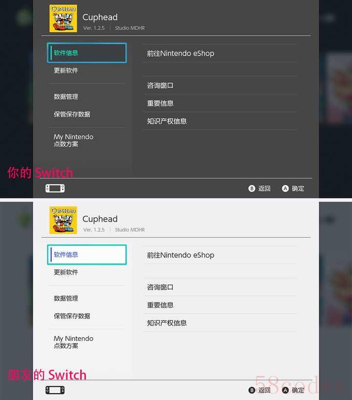 这时,你的 Switch(主机)上登陆的所有账号都可以随意游玩《茶杯头》,而朋友的 Switch(副机)上只有共享账号可以游玩《茶杯头》。如果两台 Switch 都用共享账号登陆《茶杯头》,朋友的游戏就会掉线。