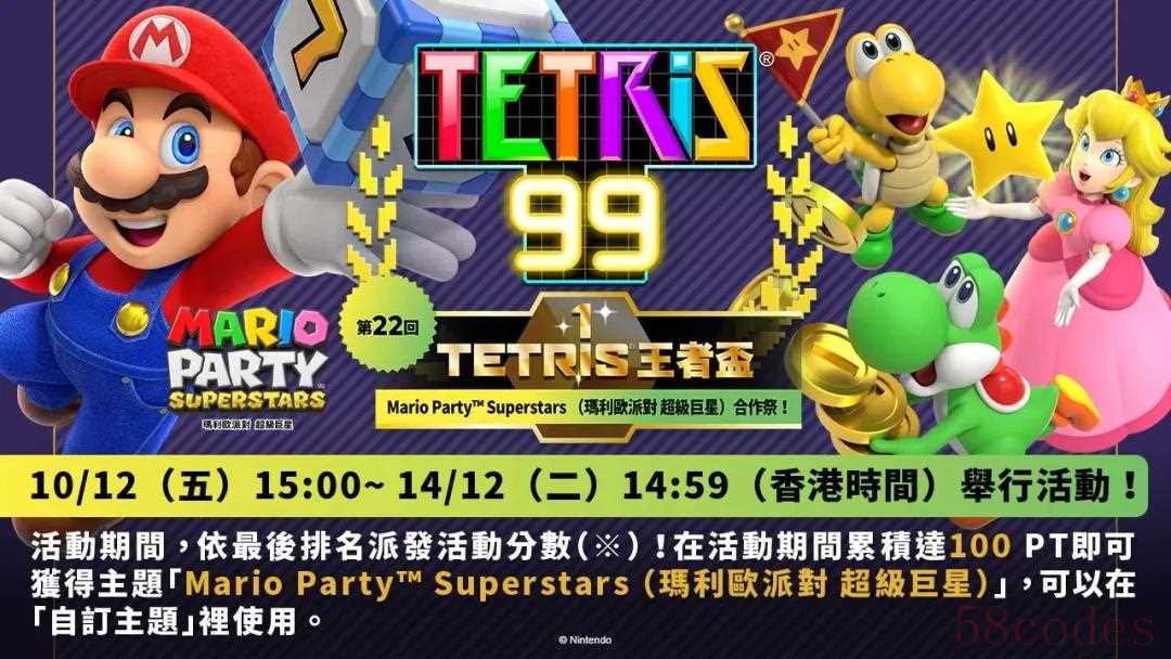 《俄罗斯方块99》将于12月10日~14日举行新联动活动,100积分可兑换《马力欧派对 超级巨星》主题。