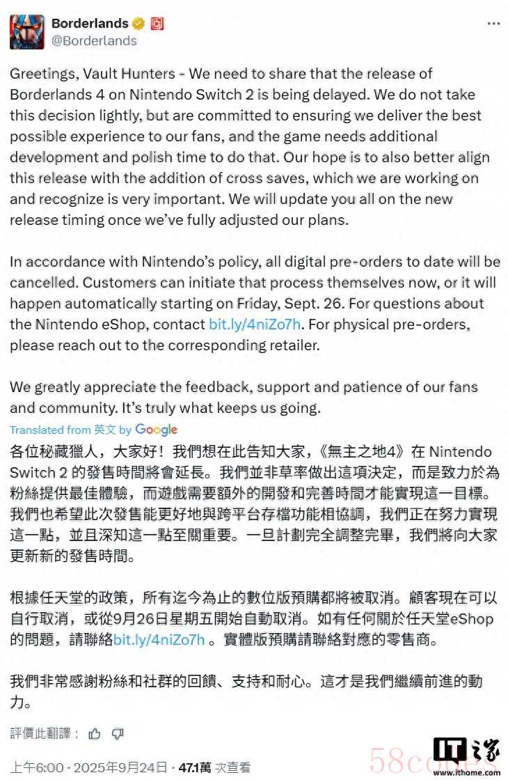 IT之家 9 月 24 日消息,Gearbox 官方今天于 X 平台宣布《无主之地 4》游戏 Switch 2 版现已无限期延迟发售。