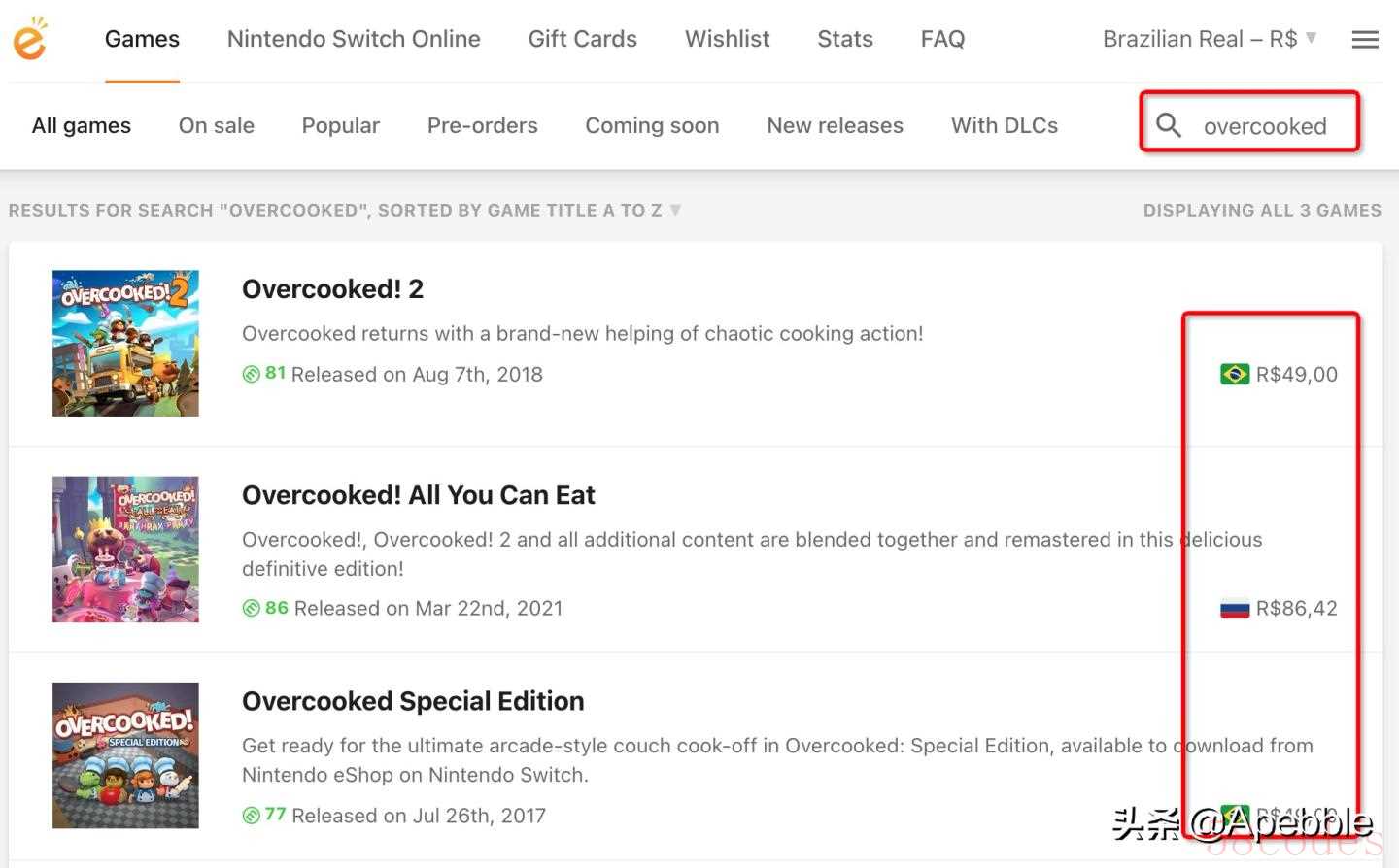 参考上面提到的修改地区的方法,登录任天堂的官网后将地区修改为对应的地区,然后在switch上再次进入eshop并选择刚刚注册的账号,即进入了对应地区的eshop。 因为我的主机默认语言是中文,巴西区的默认语言就会是葡萄牙语,虽然看不懂,但是eshop整体的布局都是相同的,其实也不影响正常购买游戏。