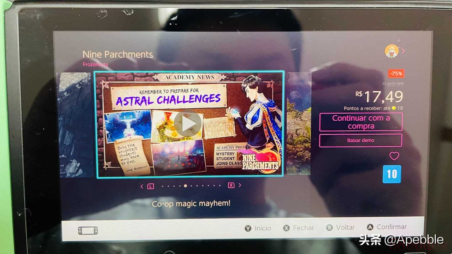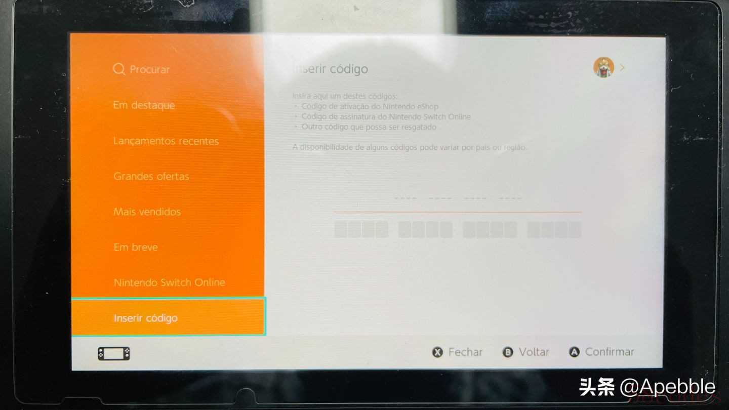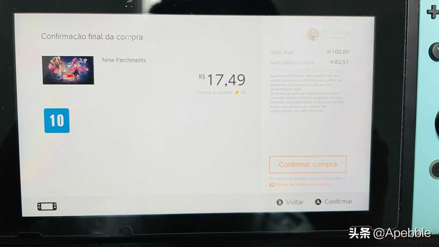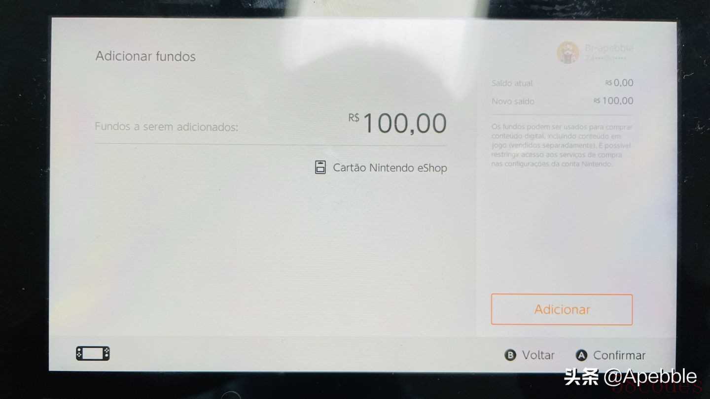 购买完成后店家会发送一个卡密,在switch上点击进入对应地区的eshop左下角的礼品卡充值,点击进入输入16位的卡密,然后点击确定进行兑换。此时账户余额中就有100巴西雷亚尔的账户余额,可以用来购买游戏了。switch上点击eshop进入商店时,如果主机的语言是中文,那么eshop的默认展示语言则是葡萄牙语,但是因为eshop的基本布局和操作步骤各个地区都高度相似,甚至关键按钮的位置和样式都是一致的,所以其实也可以靠着猜测完成兑换甚至下单。 进入eshop后点击左下角最后一个菜单即进入点卡充值页面