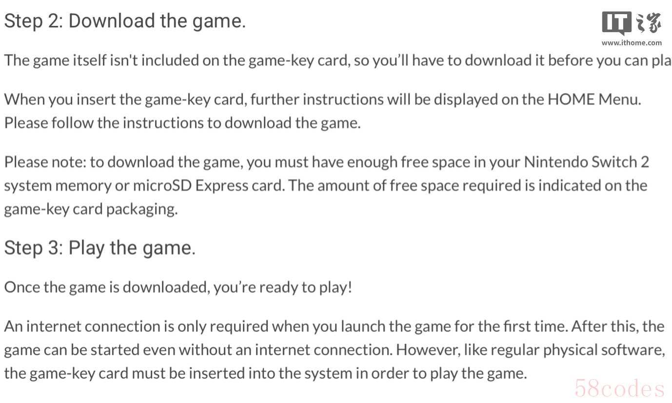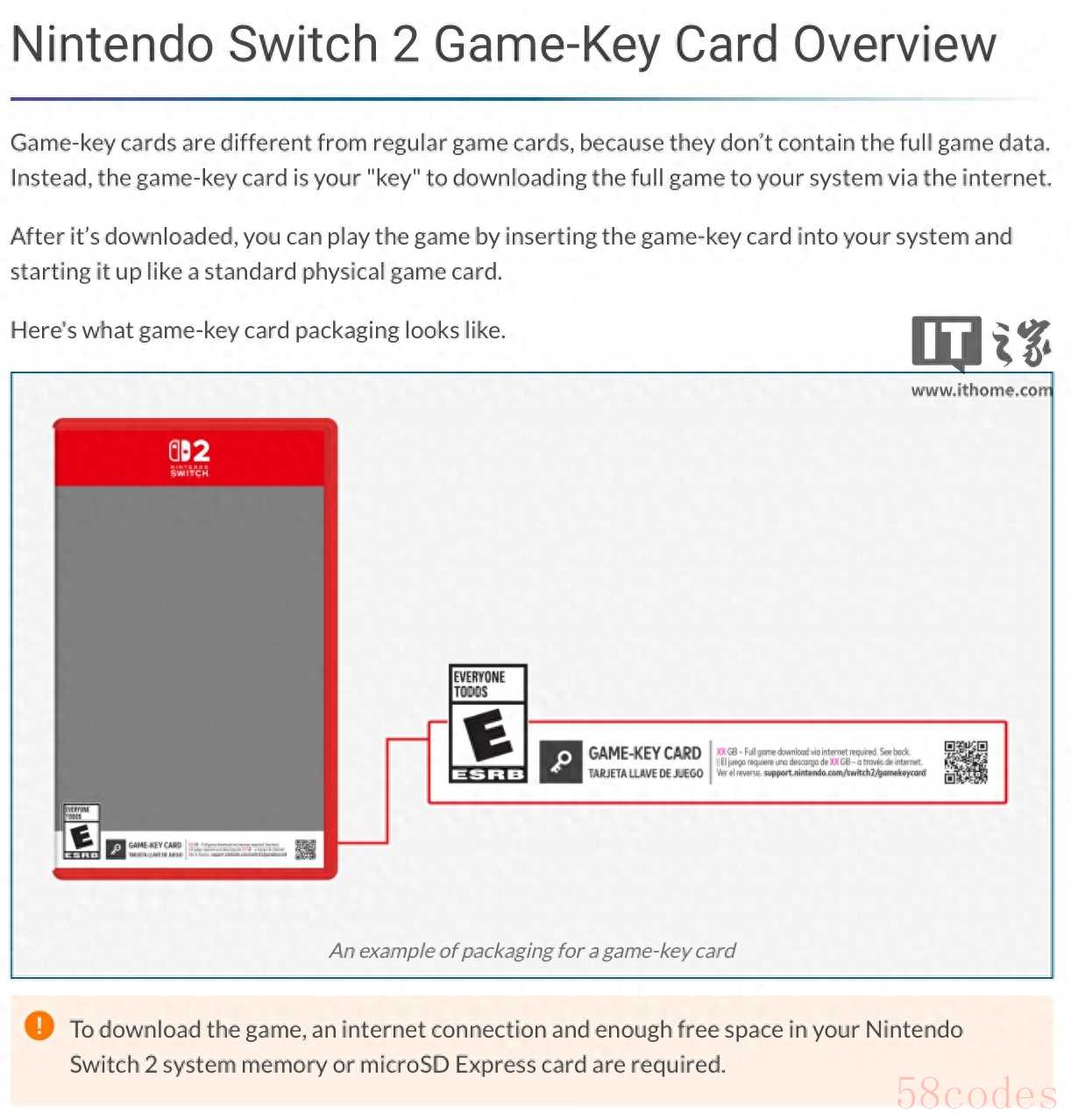 IT之家 4 月 3 日消息,任天堂今日于其客户支持网站上公布了 Switch 2 游戏密钥卡的特性,称该卡带将不包含游戏数据,需要先联网下载才能游玩。