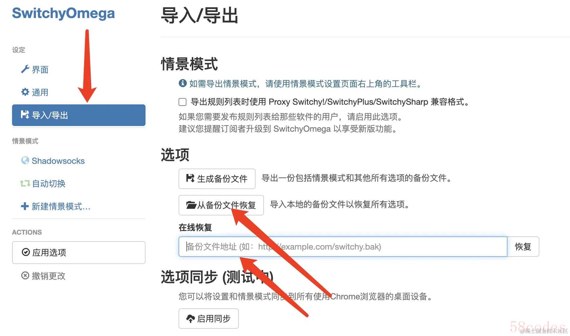 1、点击 “Proxy SwitchyOmega” > "选项" > "导入/导出" > "从备份文件中恢复" 。