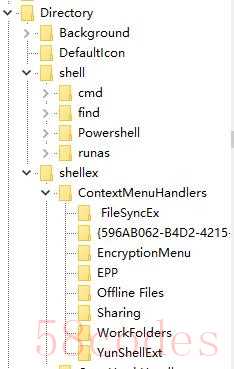 在注册表编辑器中,HKEY_CLASSES_ROOTDirectoryShell和HKEY_CLASSES_ROOTDirectoryShellexContextMenuHandlers下面,保存着和文件夹右键操作的有关菜单内容,看下面的图片上文件夹的名称很容易理解它们都代表什么的吧?