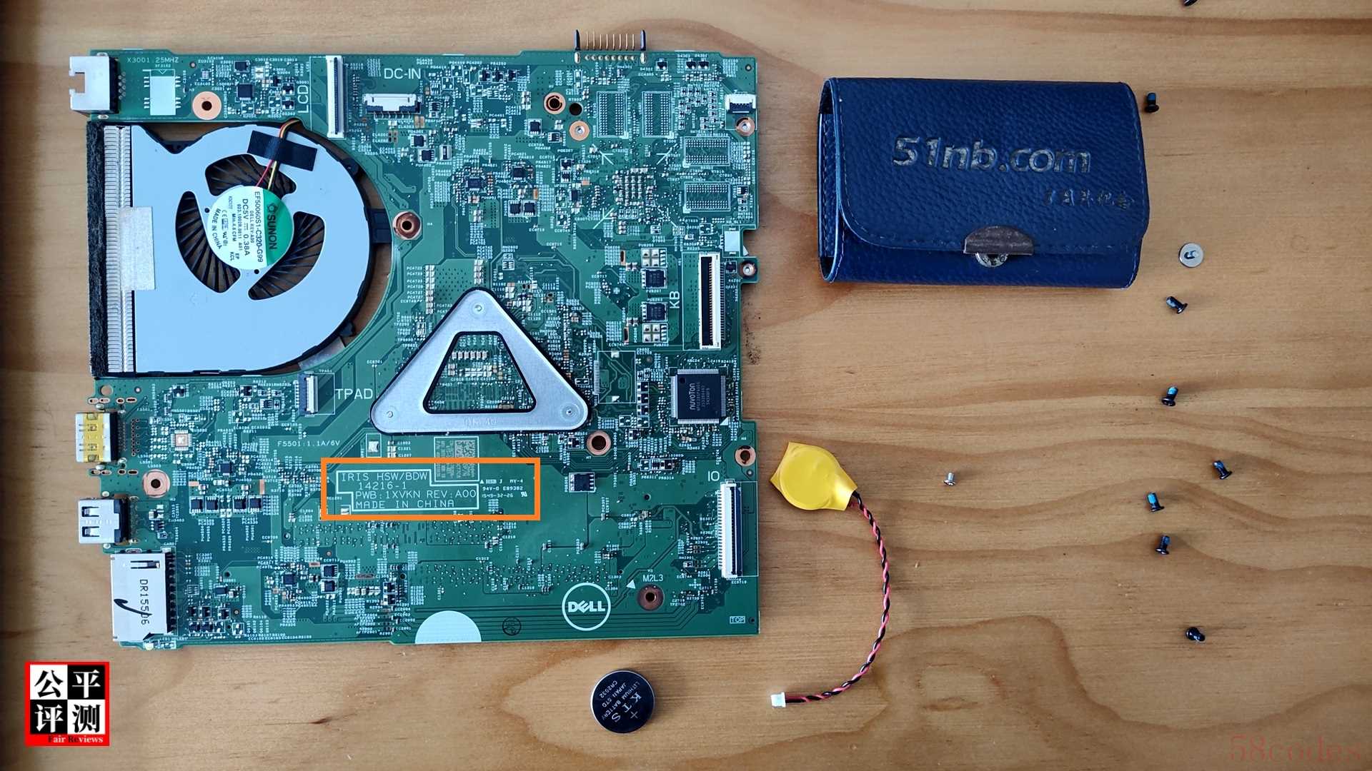 如果是官方并不单出直接销售的笔记本电脑使用的主板,一般在主板上也有印刷产品相关的内部编号的,如下图所示,就是DELL Inspiron 15的主板,主板上橙色方框中就有印刷主板的信息,依据这些信息就可以确定主板型号: