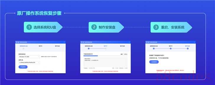 联想官方还公布了原厂操作系统的恢复的步骤,即制作U盘启动盘来重新安装系统。IT之家了解到,联想原厂系统镜像工具会持续更新,相比之下系统自带的恢复是恢复到电脑买来时的状态,系统版本一般会比较老。