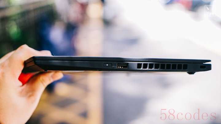 而右边则简洁很多,只有电源键,以及另一个 USB 3.1 Gen 1 接口,X1 Carbon 这两个 USB 3.1 接口是 Type-A 的,这个口对于许多商务人士可能会比较关键,因为你不知道要面对什么样的客户和设备,保留一个 Type-A 接口还是极有必要的,当然如果是 Gen 2 就更好了。