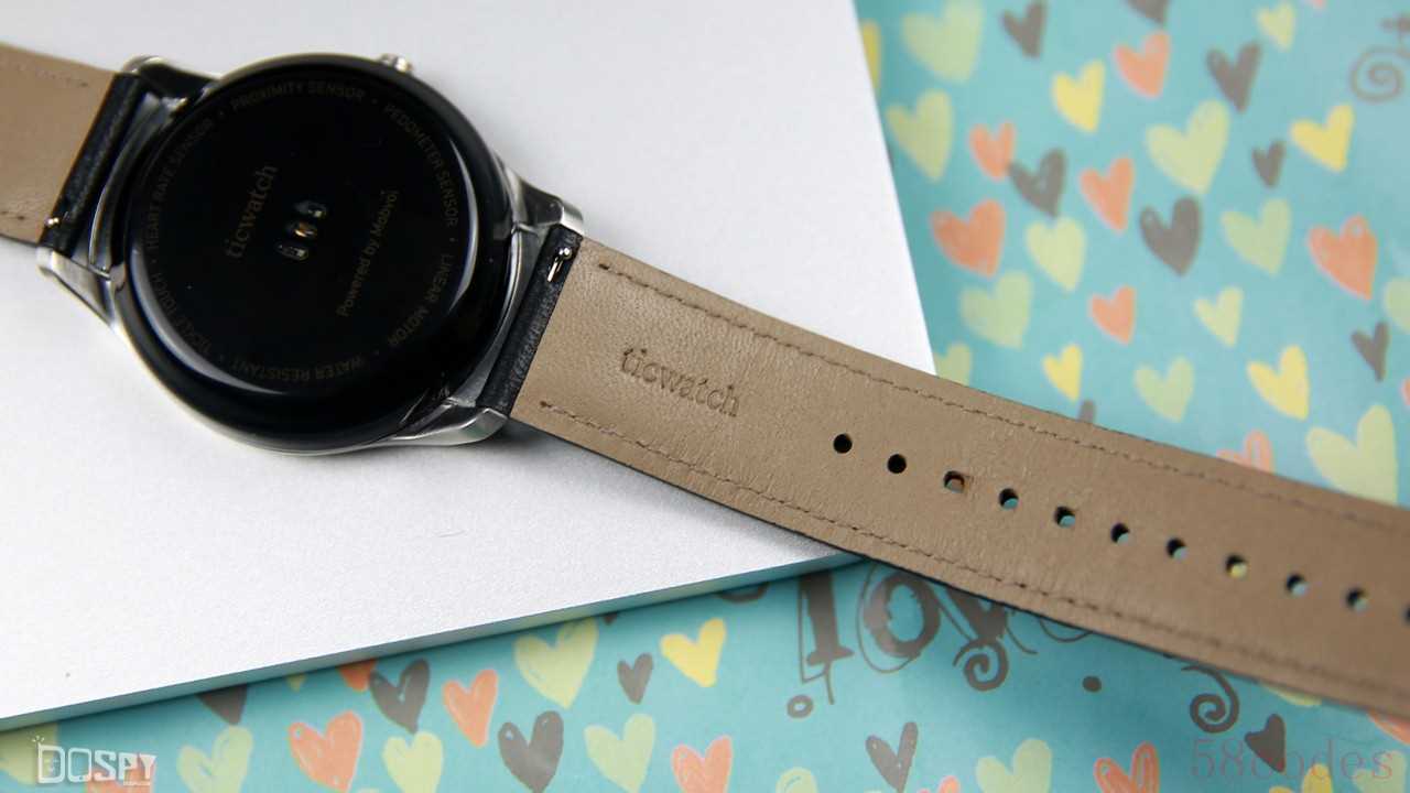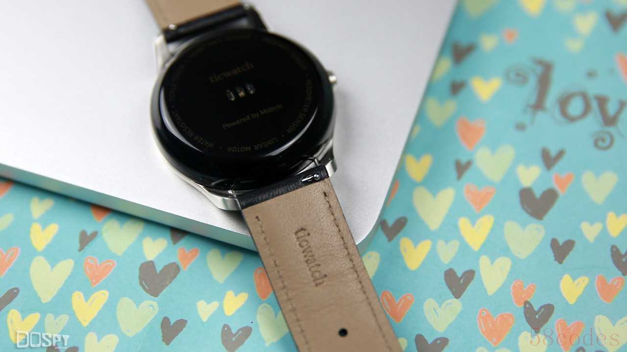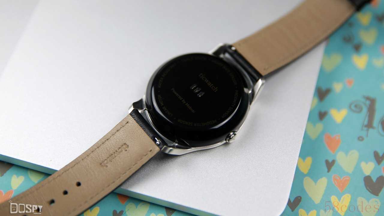 ticwatch2在背壳部分采用了钢琴烤漆后盖设计,不仅有效的降低的手表的重量,还带来了立体质感。在手表背壳的中间位置,可以看到设有动态光学心率传感器,在运动状态下依然可以准确监测心率。