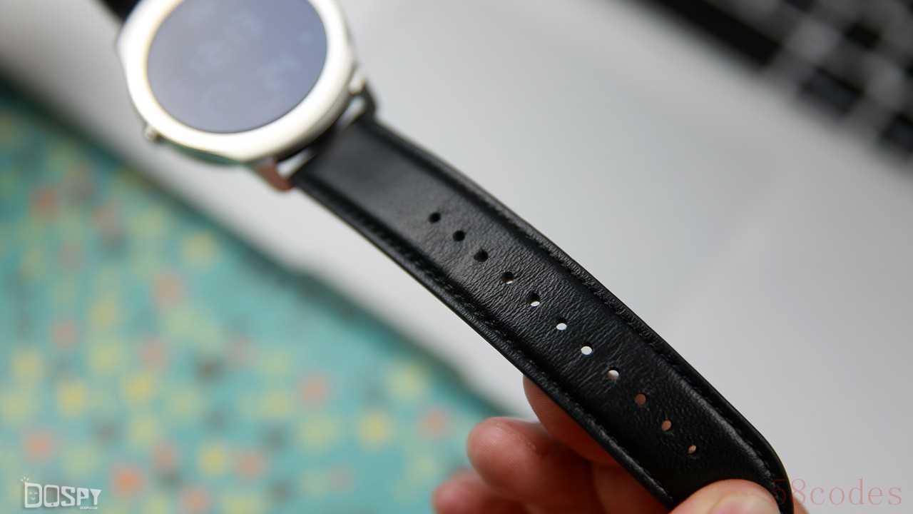 表带部分,灵大大手中这款ticwatch2选用意大利进口材质制成的真皮尖尾表带,接触手腕的部分使用丝绒触感的柔软内皮,在佩戴舒适的同时也保证耐久性以及透气性。表带宽度为标准的20mm,而用户也可以十分方便的对表带进行拆卸更换。在拆下顶部的表带后,可以看到ticwatch2表盘的顶端设有扬声器,对应的底部位置则为麦克风;位置稍显隐蔽,不过让手表整体显得更为简洁。