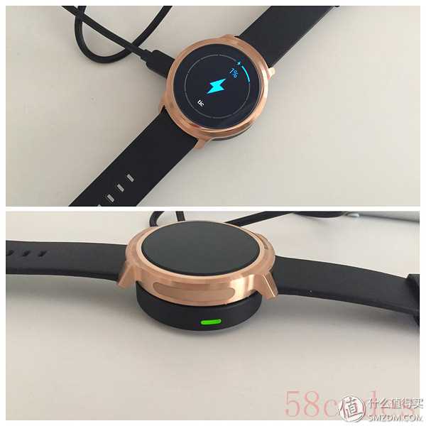 ▼充电时将手表搁置到充电器上即可,不充电时充电器闪烁红灯,充电过程闪烁绿灯,充满后闪烁绿灯,因此判断是否充电完成需要点击表冠或者屏幕: