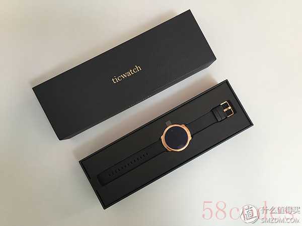 总体来看,ticwatch包装盒很有档次,黑色为底,但不是纯黑色,黑里带着点浅金光点,底色之上用金色书写文字,看起来既内敛又优雅,含蓄又成熟。
