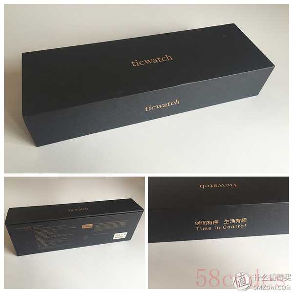 ▼撕开最外层的塑料薄膜,盒子带点磨砂质感,顶部和正前面都印有ticwatch的标志;正后面印有中英文的宣传语:“时间有序,生活有趣”;底部是相关配置信息介绍: