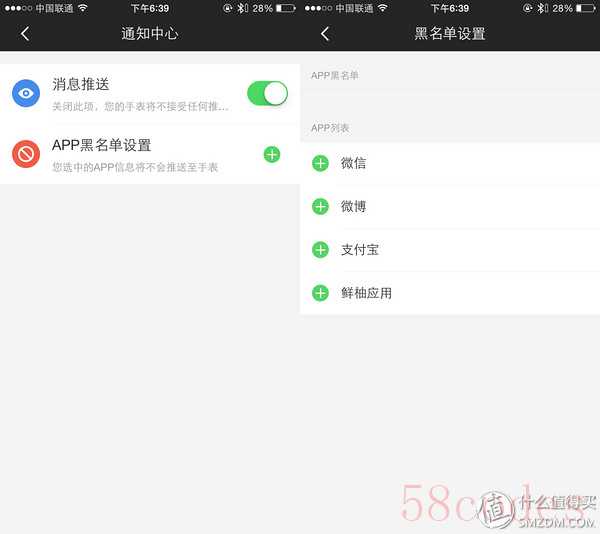 ▼通知中心包括消息推送的开关以及APP黑名单设置,所谓黑名单设置指的是被选中的APP不会推送至手表,iPhone支持的通知APP列表非常少: